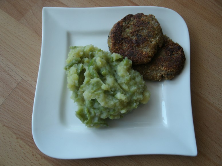 Bratlinge formen und in einer Pfanne, knusprig anbraten und zu dem Bohnendurcheinander reichen.