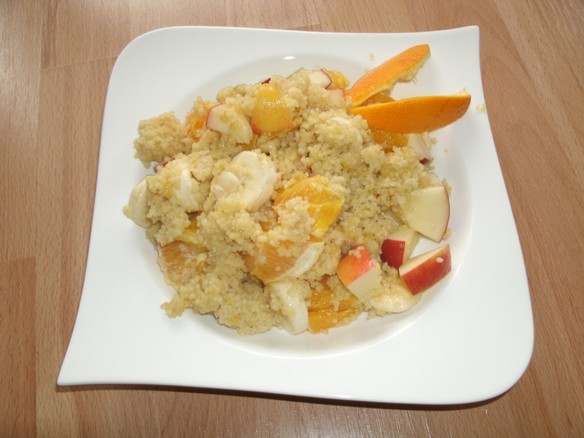 Nun das Obst mit der noch heißen Hirse vermengen und nach Geschmack Agavensirub hinzugeben.