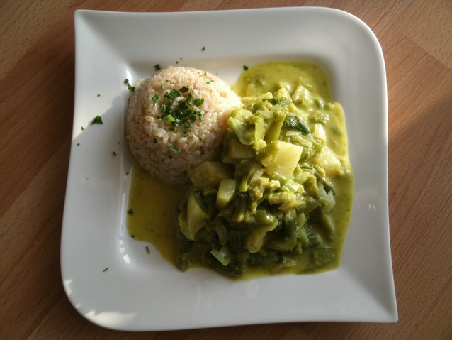 Salz, Pfeffer, Curry, Knoblauch, Ingwer, Zitronensaft und Agavendicksaft abschmecken. Mit Naturreis anrichten.