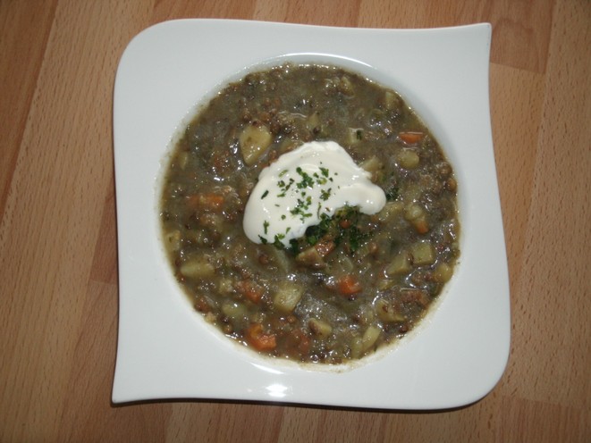 Mit etwas Sojajoghurt und Kräuter anrichten.
